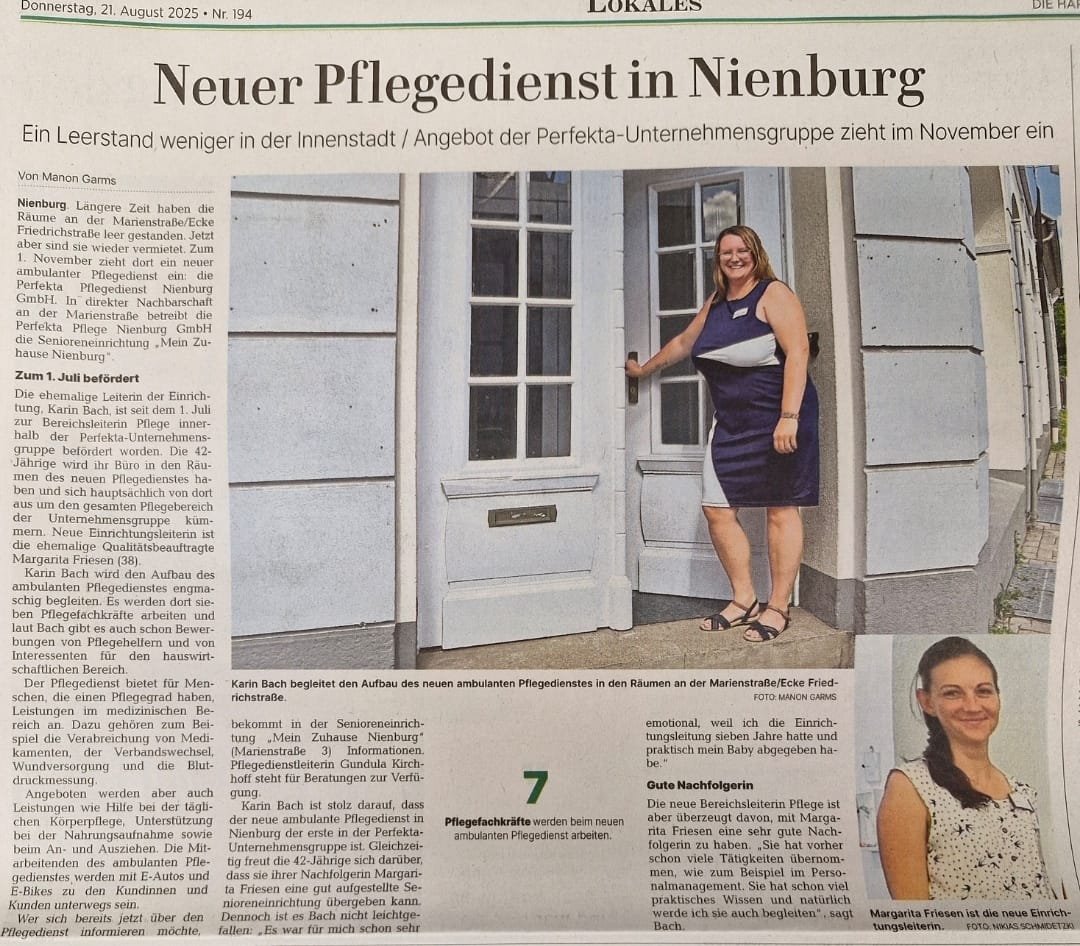 Die PERFEKTA Pflege ist Teil der PERFEKTA Unternehmensgruppe. Das 1921 gegründete und heute in 4. und 5. Generation inhabergeführte Familienunternehmen mit über 5.000 Mitarbeitern an mehr als 20 Standorten in Deutschland bietet neben dem Kerngeschäft, der Gebäudereinigung, ein umfangreiches Dienstleistungsangebot rund um Mensch und Immobilie an. Dazu zählen Catering, Garten- und Landschaftsbau, Facility Management, Baudienstleistungen, Projektsteuerung, die Herstellung von Reinigungschemie sowie Wäschedienstleistungen über die eigenen Großwäschereien.