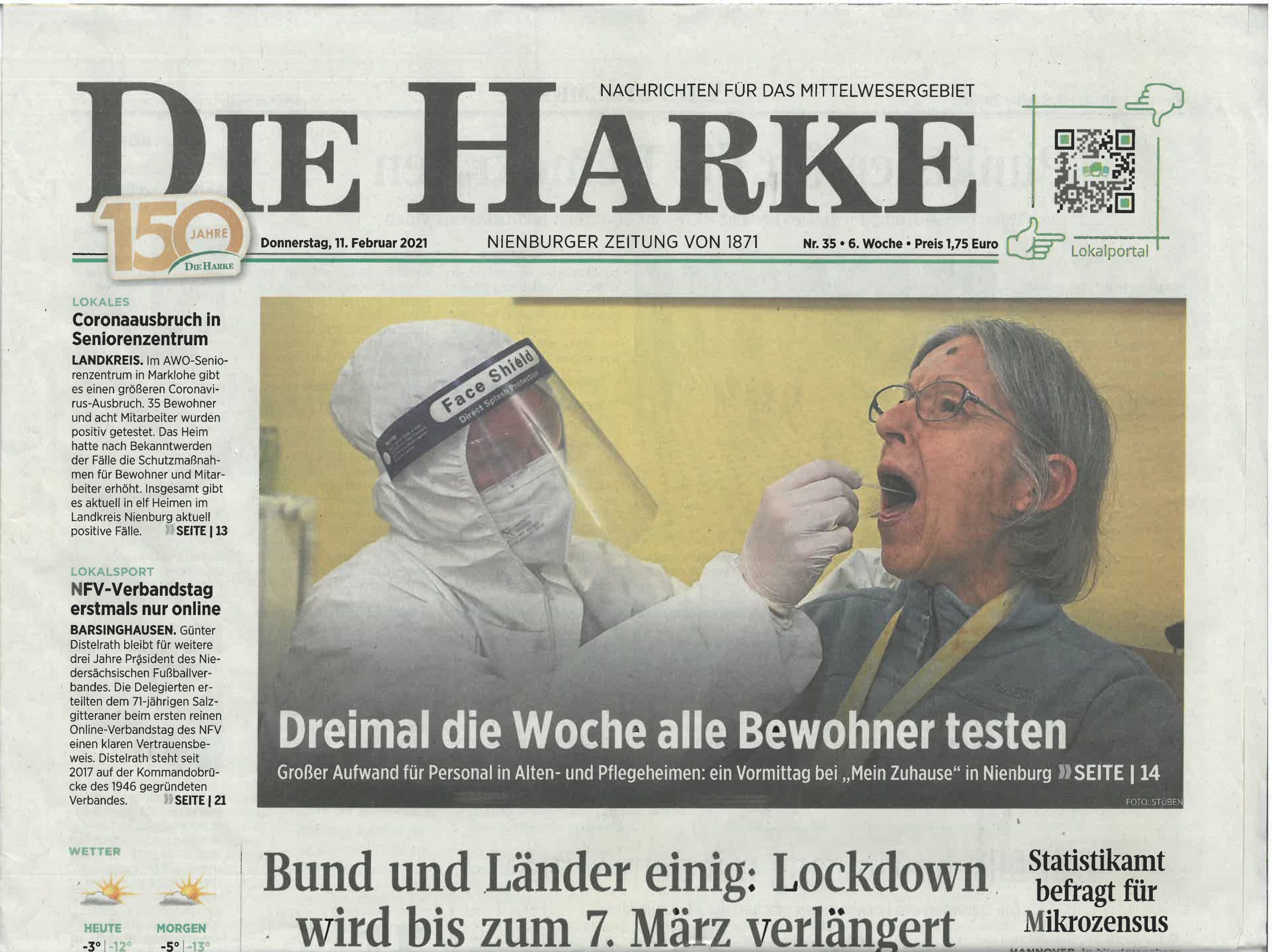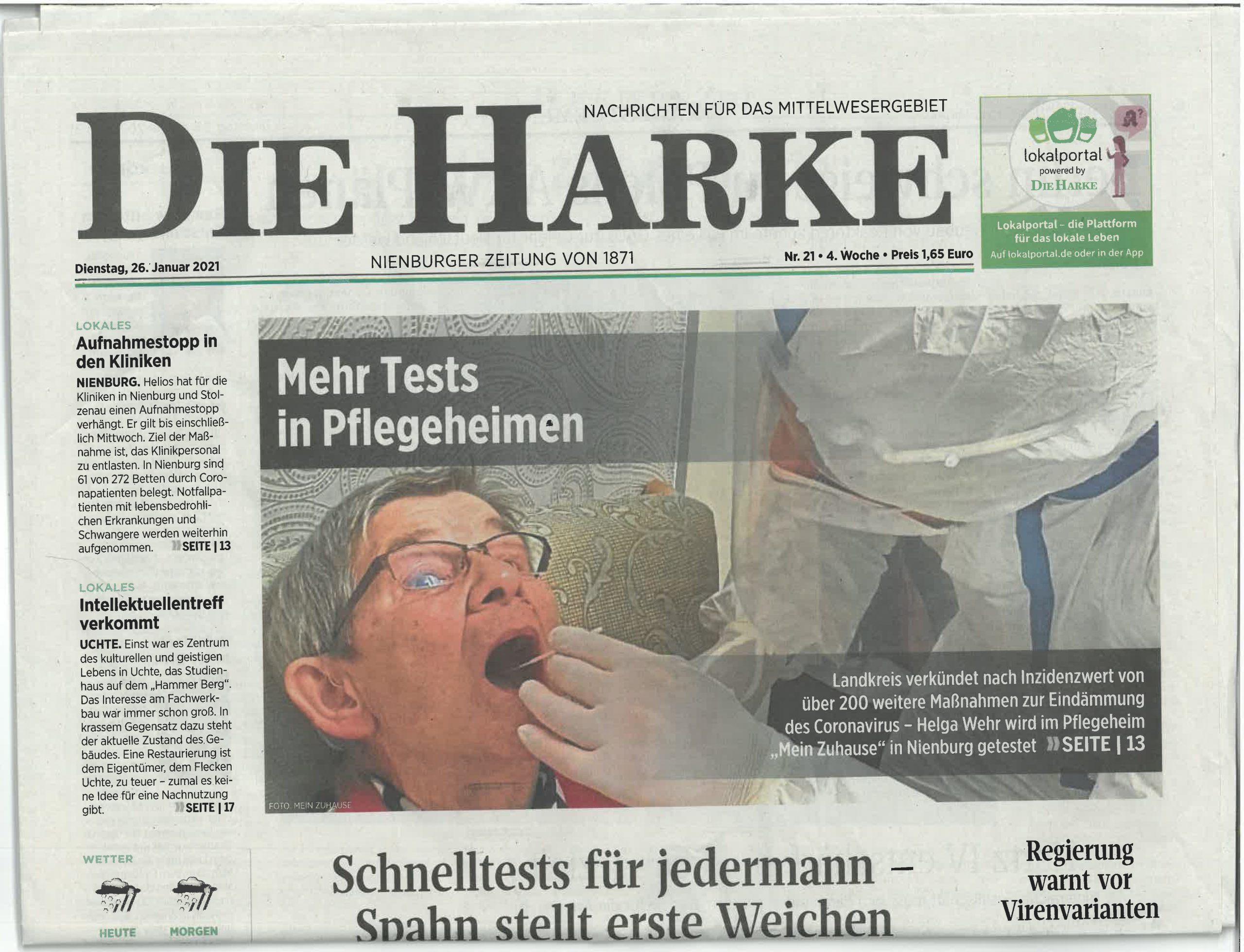 Gallerie Aktuelles, Mein Zuhause Nienburg Mein Zuhause Nienburg: Dreimal die Woche alle Bewohner testen (Artikel aus “Die Harke”) Aktuelles, Mein Zuhause Nienburg